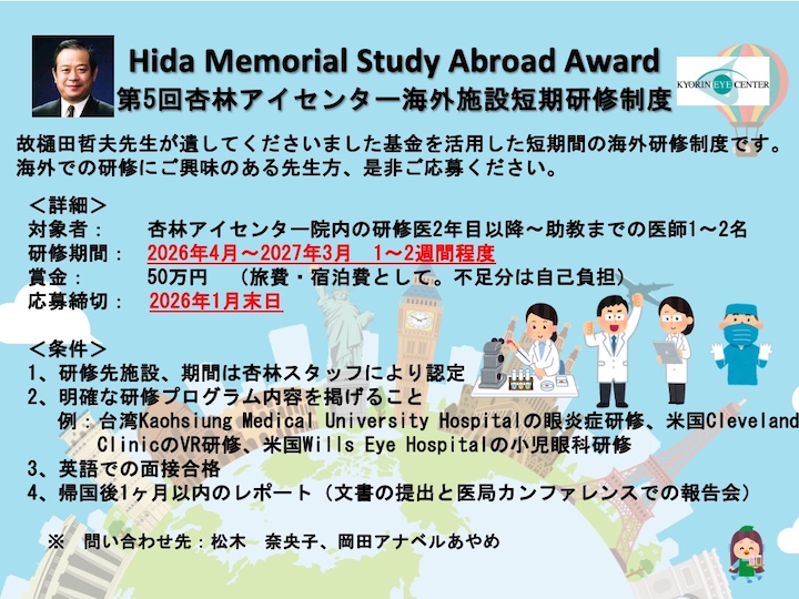 アイセンターの大恩師でいらっしゃる故樋田教授のご家族から頂いた寄付金を活躍するため「Hida Memorial Study Abroad Award」を設立いたしました。 杏林眼科学教室の永遠の発展を願っていた樋田先生の生前の強いご遺志を尊重し、このアワードでは若い先生のグローバルマインドを育成するため海外への短期研修(1~2週間程度)をサポートする事としています。
